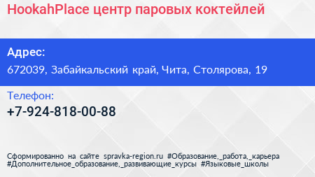 HookahPlace, центр паровых коктейлей по адресу 672039, Забайкальский край, Чита, Столярова, 19 в дальнейшем Организация, размещена в следующих категориях: