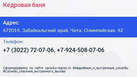 Кедровая баня по адресу 672014, Забайкальский край, Чита, Олимпийская, 42 в дальнейшем Организация, размещена в следующих категориях: