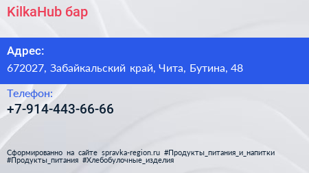 KilkaHub, бар по адресу 672027, Забайкальский край, Чита, Бутина, 48 в дальнейшем Организация, размещена в следующих категориях:
