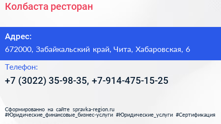 Колбаста, ресторан по адресу 672000, Забайкальский край, Чита, Хабаровская, 6 в дальнейшем Организация, размещена в следующих категориях: