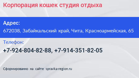 Корпорация кошек, студия отдыха по адресу 672038, Забайкальский край, Чита, Красноармейская, 65 в дальнейшем Организация, размещена в следующих категориях: