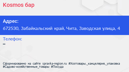 Kosmos, бар по адресу 672530, Забайкальский край, Чита, Заводская улица, 4 в дальнейшем Организация, размещена в следующих категориях: