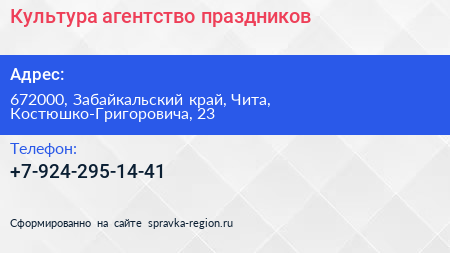 Культура, агентство праздников по адресу 672000, Забайкальский край, Чита, Костюшко-Григоровича, 23 в дальнейшем Организация, размещена в следующих категориях: