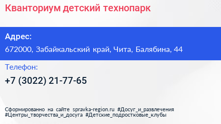 Кванториум, детский технопарк по адресу 672000, Забайкальский край, Чита, Балябина, 44 в дальнейшем Организация, размещена в следующих категориях: