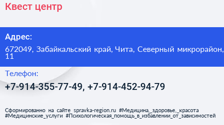Квест-центр по адресу 672049, Забайкальский край, Чита, Северный микрорайон, 11 в дальнейшем Организация, размещена в следующих категориях: