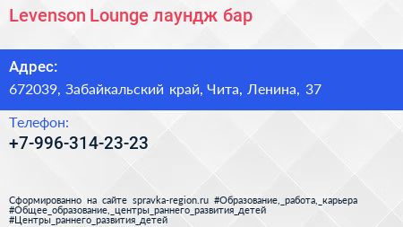 Levenson Lounge, лаундж-бар по адресу 672039, Забайкальский край, Чита, Ленина, 37 в дальнейшем Организация, размещена в следующих категориях: