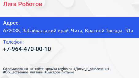 Лига Роботов по адресу 672038, Забайкальский край, Чита, Красной Звезды, 51а в дальнейшем Организация, размещена в следующих категориях: