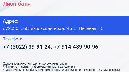 Лион, баня по адресу 672030, Забайкальский край, Чита, Весенняя, 3 в дальнейшем Организация, размещена в следующих категориях: