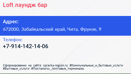 Loft, лаундж-бар по адресу 672000, Забайкальский край, Чита, Фрунзе, 9 в дальнейшем Организация, размещена в следующих категориях: