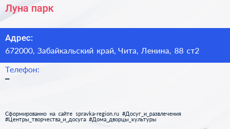 Луна-парк по адресу 672000, Забайкальский край, Чита, Ленина, 88 ст2 в дальнейшем Организация, размещена в следующих категориях: