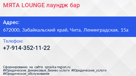МЯТА LOUNGE, лаундж-бар по адресу 672000, Забайкальский край, Чита, Ленинградская, 15а в дальнейшем Организация, размещена в следующих категориях: