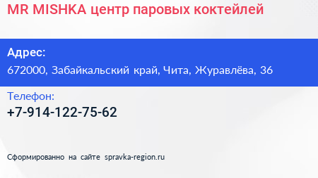 MR.MISHKA, центр паровых коктейлей по адресу 672000, Забайкальский край, Чита, Журавлёва, 36 в дальнейшем Организация, размещена в следующих категориях: