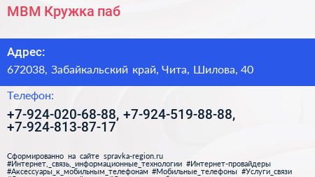 МВМ Кружка, паб по адресу 672038, Забайкальский край, Чита, Шилова, 40 в дальнейшем Организация, размещена в следующих категориях: