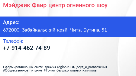 Мэйджик Фаир, центр огненного шоу по адресу 672000, Забайкальский край, Чита, Бутина, 51 в дальнейшем Организация, размещена в следующих категориях:
