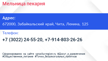 Мельница, пекарня по адресу 672000, Забайкальский край, Чита, Ленина, 125 в дальнейшем Организация, размещена в следующих категориях: