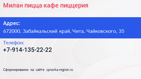 Милан-пицца, кафе-пиццерия по адресу 672000, Забайкальский край, Чита, Чайковского, 35 в дальнейшем Организация, размещена в следующих категориях: