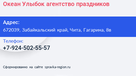 Океан Улыбок, агентство праздников по адресу 672039, Забайкальский край, Чита, Гагарина, 8в в дальнейшем Организация, размещена в следующих категориях: