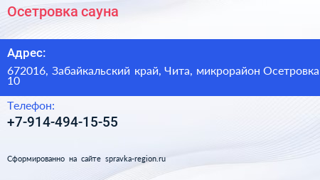 Осетровка, сауна по адресу 672016, Забайкальский край, Чита, микрорайон Осетровка, 10 в дальнейшем Организация, размещена в следующих категориях: