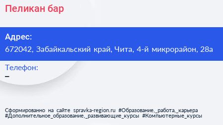 Пеликан, бар по адресу 672042, Забайкальский край, Чита, 4-й микрорайон, 28а в дальнейшем Организация, размещена в следующих категориях: