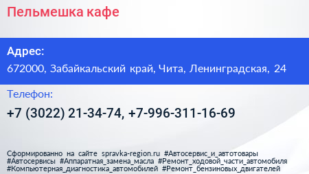 Пельмешка, кафе по адресу 672000, Забайкальский край, Чита, Ленинградская, 24 в дальнейшем Организация, размещена в следующих категориях:
