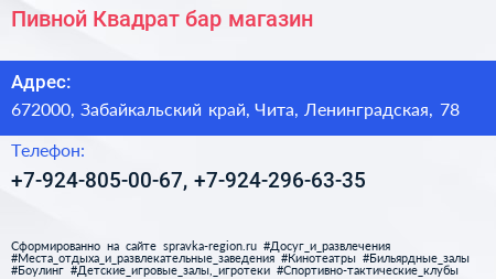 Пивной Квадрат, бар-магазин по адресу 672000, Забайкальский край, Чита, Ленинградская, 78 в дальнейшем Организация, размещена в следующих категориях: