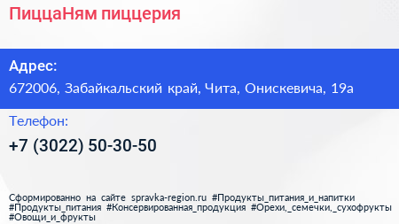 ПиццаНям, пиццерия по адресу 672006, Забайкальский край, Чита, Онискевича, 19а в дальнейшем Организация, размещена в следующих категориях: