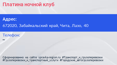 Платина, ночной клуб по адресу 672020, Забайкальский край, Чита, Лазо, 40 в дальнейшем Организация, размещена в следующих категориях: