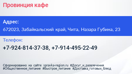 Провинция, кафе по адресу 672023, Забайкальский край, Чита, Назара Губина, 23 в дальнейшем Организация, размещена в следующих категориях: