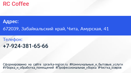 RC Coffee по адресу 672039, Забайкальский край, Чита, Амурская, 41 в дальнейшем Организация, размещена в следующих категориях: