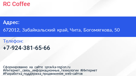 RC Coffee по адресу 672012, Забайкальский край, Чита, Богомягкова, 50 в дальнейшем Организация, размещена в следующих категориях: