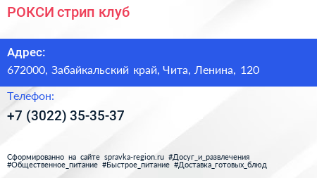РОКСИ, стрип-клуб по адресу 672000, Забайкальский край, Чита, Ленина, 120 в дальнейшем Организация, размещена в следующих категориях: