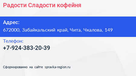 Радости & Сладости, кофейня по адресу 672000, Забайкальский край, Чита, Чкалова, 149 в дальнейшем Организация, размещена в следующих категориях: