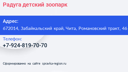 Радуга, детский зоопарк по адресу 672014, Забайкальский край, Чита, Романовский тракт, 46 в дальнейшем Организация, размещена в следующих категориях: