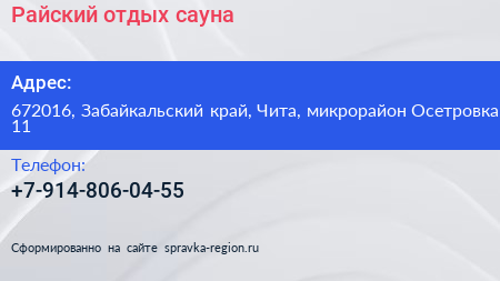 Райский отдых, сауна по адресу 672016, Забайкальский край, Чита, микрорайон Осетровка, 11 в дальнейшем Организация, размещена в следующих категориях: