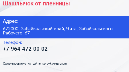 Шашлычок от пленницы по адресу 672000, Забайкальский край, Чита, Забайкальского Рабочего, 67 в дальнейшем Организация, размещена в следующих категориях: