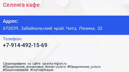 Селенга, кафе по адресу 672039, Забайкальский край, Чита, Ленина, 32 в дальнейшем Организация, размещена в следующих категориях: