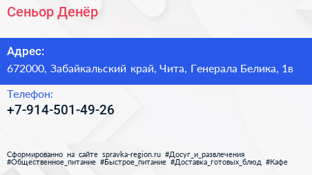 Сеньор Денёр по адресу 672000, Забайкальский край, Чита, Генерала Белика, 1в в дальнейшем Организация, размещена в следующих категориях: