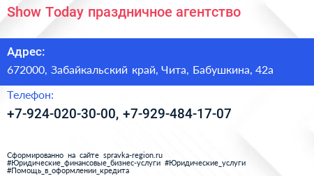 Show Today, праздничное агентство по адресу 672000, Забайкальский край, Чита, Бабушкина, 42а в дальнейшем Организация, размещена в следующих категориях: