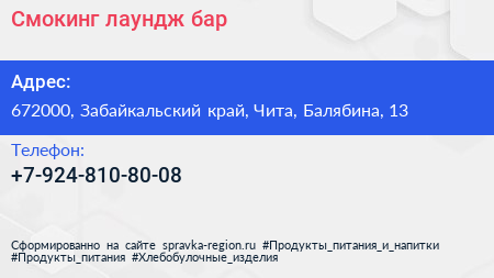 Смокинг, лаундж-бар по адресу 672000, Забайкальский край, Чита, Балябина, 13 в дальнейшем Организация, размещена в следующих категориях: