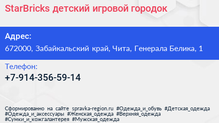 StarBricks, детский игровой городок по адресу 672000, Забайкальский край, Чита, Генерала Белика, 1 в дальнейшем Организация, размещена в следующих категориях: