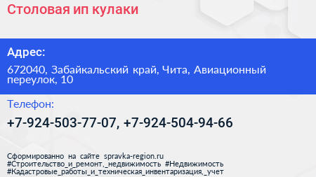 Столовая, ип кулаки по адресу 672040, Забайкальский край, Чита, Авиационный переулок, 10 в дальнейшем Организация, размещена в следующих категориях: