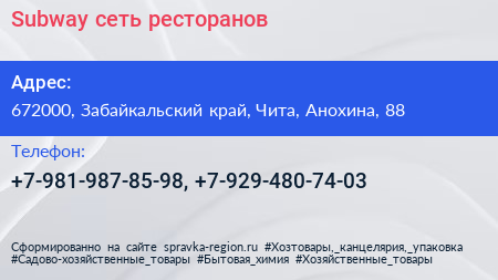 Subway, сеть ресторанов по адресу 672000, Забайкальский край, Чита, Анохина, 88 в дальнейшем Организация, размещена в следующих категориях: