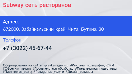 Subway, сеть ресторанов по адресу 672000, Забайкальский край, Чита, Бутина, 30 в дальнейшем Организация, размещена в следующих категориях: