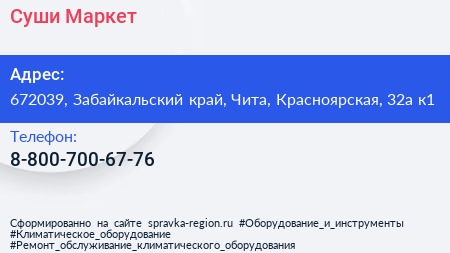 Суши-Маркет по адресу 672039, Забайкальский край, Чита, Красноярская, 32а к1 в дальнейшем Организация, размещена в следующих категориях: