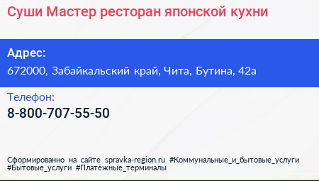 Суши Мастер, ресторан японской кухни по адресу 672000, Забайкальский край, Чита, Бутина, 42а в дальнейшем Организация, размещена в следующих категориях: