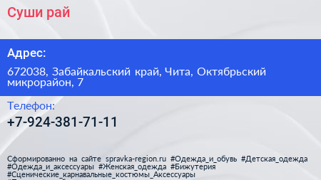 Суши рай по адресу 672038, Забайкальский край, Чита, Октябрьский микрорайон, 7 в дальнейшем Организация, размещена в следующих категориях: