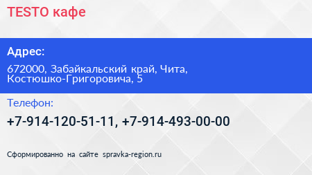 TESTO, кафе по адресу 672000, Забайкальский край, Чита, Костюшко-Григоровича, 5 в дальнейшем Организация, размещена в следующих категориях: