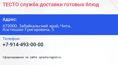 ТЕСТО, служба доставки готовых блюд по адресу 672000, Забайкальский край, Чита, Костюшко-Григоровича, 5 в дальнейшем Организация, размещена в следующих категориях: