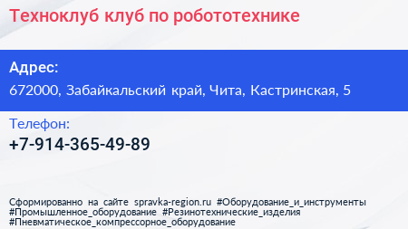 Техноклуб, клуб по робототехнике по адресу 672000, Забайкальский край, Чита, Кастринская, 5 в дальнейшем Организация, размещена в следующих категориях: