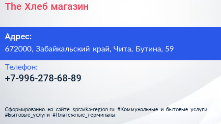 The Хлеб, магазин по адресу 672000, Забайкальский край, Чита, Бутина, 59 в дальнейшем Организация, размещена в следующих категориях: